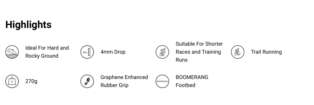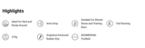 TRAILFLY SPEED har 4 mm gummiknotter som er nøye plassert i et mønster. Disse knottene forbedrer grepet, fjerner rusk raskt, øker fremdriften og hjelper deg med å bremse med hælen. Den grafèn forsterkede gummiblandingen gir deg et unikt slitesterkt og fast grep og trekkraft på hardt, steinete underlag. Formuleringen av denne gummien er også forbedret fra tidligere TRAILFLY-modeller, noe som gir deg et ennå bedre feste på våte underlag.